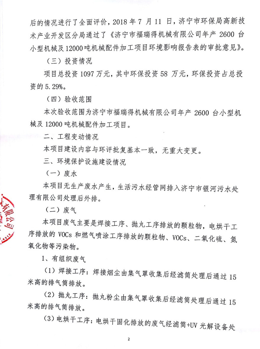 濟(jì)寧市福瑞得機(jī)械有限公司年產(chǎn)2600臺小型機(jī)械及12000噸機(jī)械配件加工項(xiàng)目(廢氣、廢水)竣