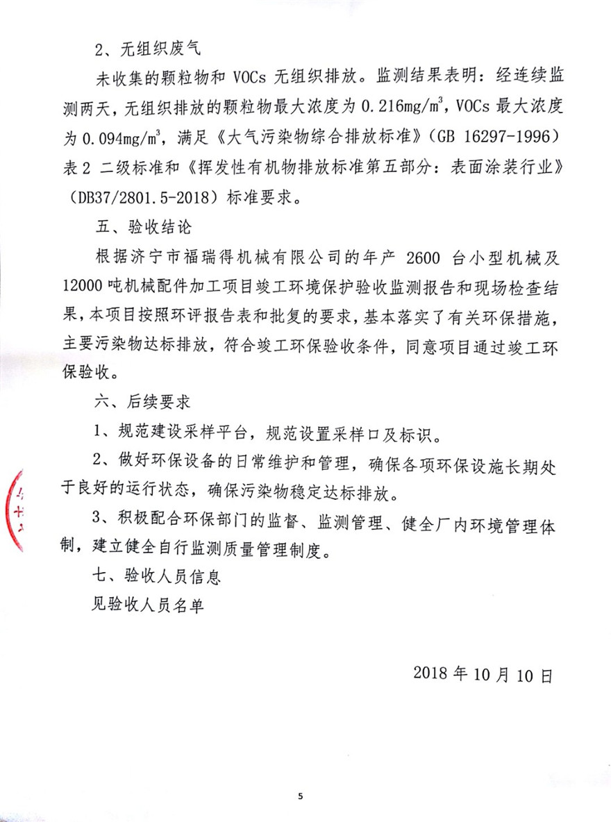 濟(jì)寧市福瑞得機(jī)械有限公司年產(chǎn)2600臺小型機(jī)械及12000噸機(jī)械配件加工項(xiàng)目(廢氣、廢水)竣工環(huán)境保護(hù)驗(yàn)收意見
