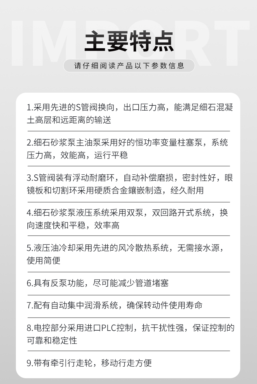 25型二次構(gòu)造柱專用輸送泵是一種復(fù)合泵送要求的混凝土泵,通過水平或垂直安裝的管道,連續(xù)輸送到澆注現(xiàn)場的細(xì)石混凝土輸送設(shè)備。 廣泛應(yīng)用于二次構(gòu)造柱填充、地暖工程、屋面、高層建筑的墻、水庫、水電站、港口、碼頭、基礎(chǔ)處理 軟弱地基 加固注漿 隧